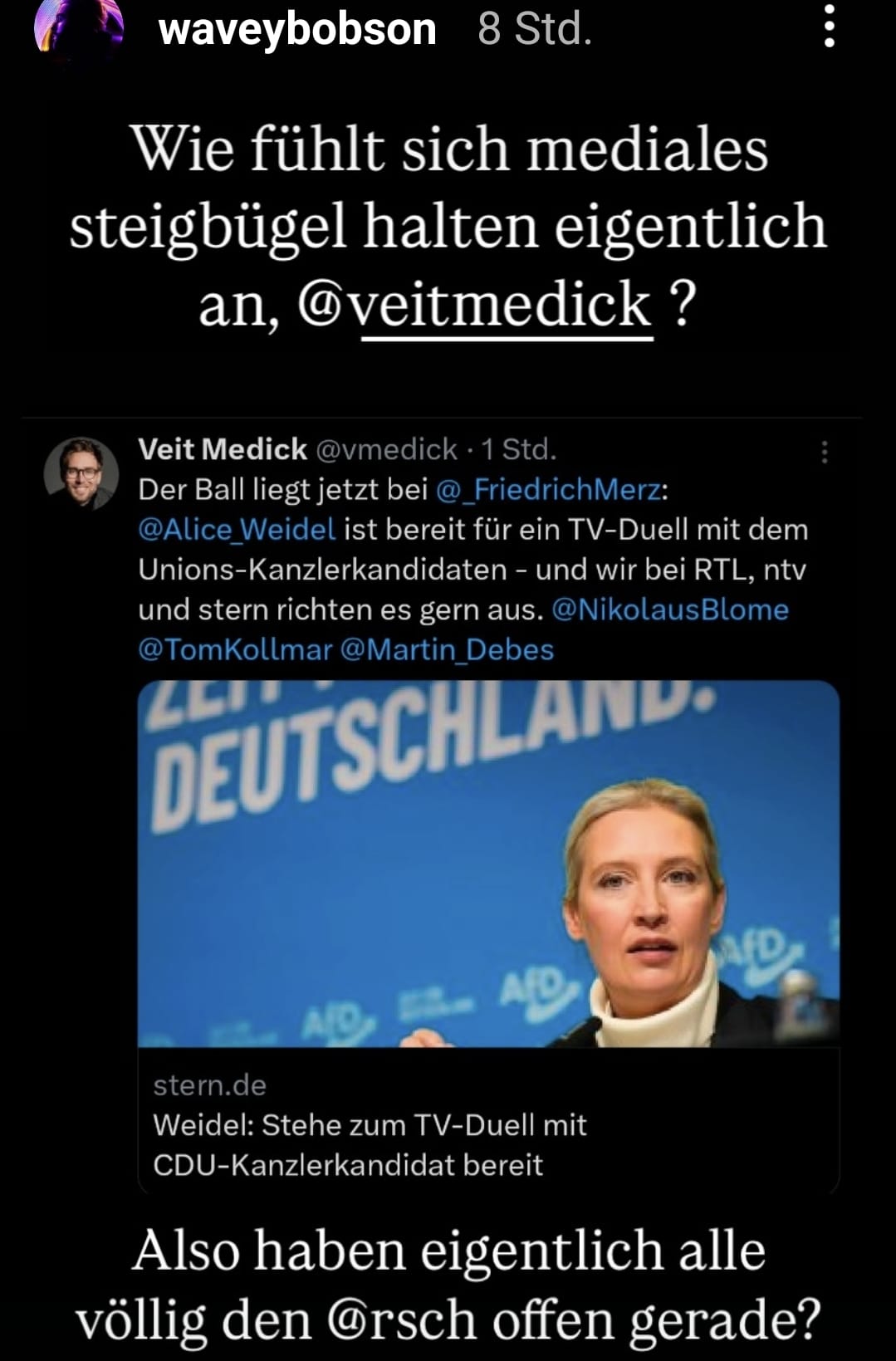 [….] Nach einer kurzen Runde durch die politische Großwetterlage [….] fragte Moderatorin Sandra Maischberger die beiden Spitzenkandidatinnen, wie sie auf die Amtseinführung von Donald Trump blickten. [….] Alice Weidel angesprochen, die Trump einen „Friedenspräsidenten“ nannte [….] Schließlich war das erst der Auftakt des Gesprächs, in dessen weiterem Verlauf Alice Weidel eine bewusst platzierte Geschichtsfälschung noch einmal wiederholen durfte. [….] Jeder Hufeisen-Theoretiker durfte sich sodann bestätigt sehen, als beide Politikerinnen bald wieder über die Behauptung zusammenfanden, der sogenannte Meinungskorridor werde „immer enger“. [….] Schließlich hatte sich die Redaktion der Sendung dazu entschieden, Alice Weidel noch einmal zu ihrer geschichtsfälschenden Behauptung zu befragen, Adolf Hitler sei ein Kommunist gewesen. Als würde dabei eine Erklärung weiterhelfen. Man spielte gar den entsprechenden Ausschnitt aus ihrem Gespräch mit Elon Musk noch einmal ein. „Woran machen Sie das fest?“, fragte Maischberger Weidel. „Ich mache das daran fest, dass Adolf Hitler einen neuen Menschen schaffen wollte“, begann diese ihre Antwort und spätestens hier hatte die Sendung ein Problem. Denn dem, was Weidel daraufhin von sich gab, fehlt jede historische Basis. Was Weidel davor auf dem privaten Netzwerk eines Tech-Milliardärs behauptet hatte, durfte sie nun im öffentlich-rechtlichen Fernsehen „erklären“. Es zu wiederholen, käme einer Normalisierung des Gesagten gleich. Hitler „war im Geiste ein Linker“, schloss sie ihren vor geschichtsfälschenden Aussagen strotzenden Versuch, den faschistischen Diktator des „Dritten Reichs “umzudeuten. [….]